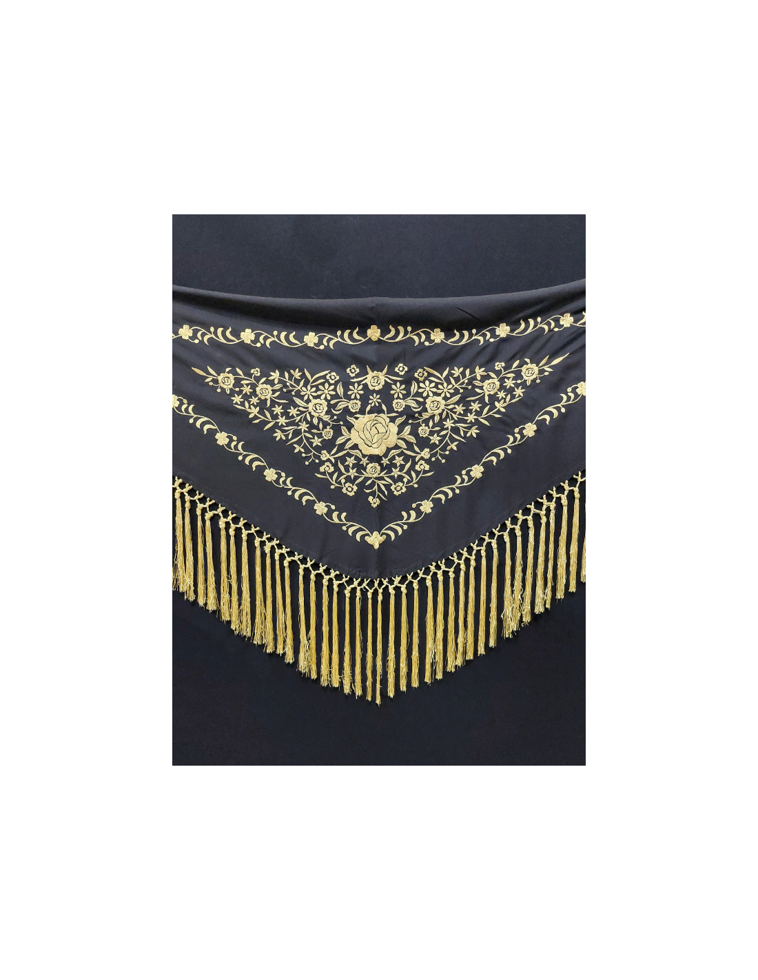 EMBROIDERED SHAWL, BLACK COLOR, GOLD FRINGES
