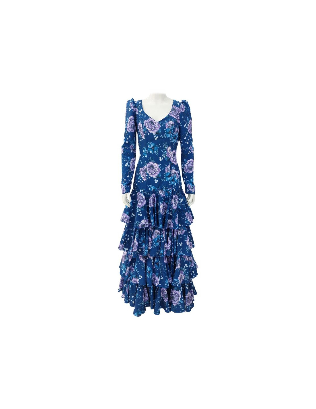 Dress for professional use. Made of crepe, a very flared fabric with many colors and patterns for choose. The model has four frills that begin in the hips.