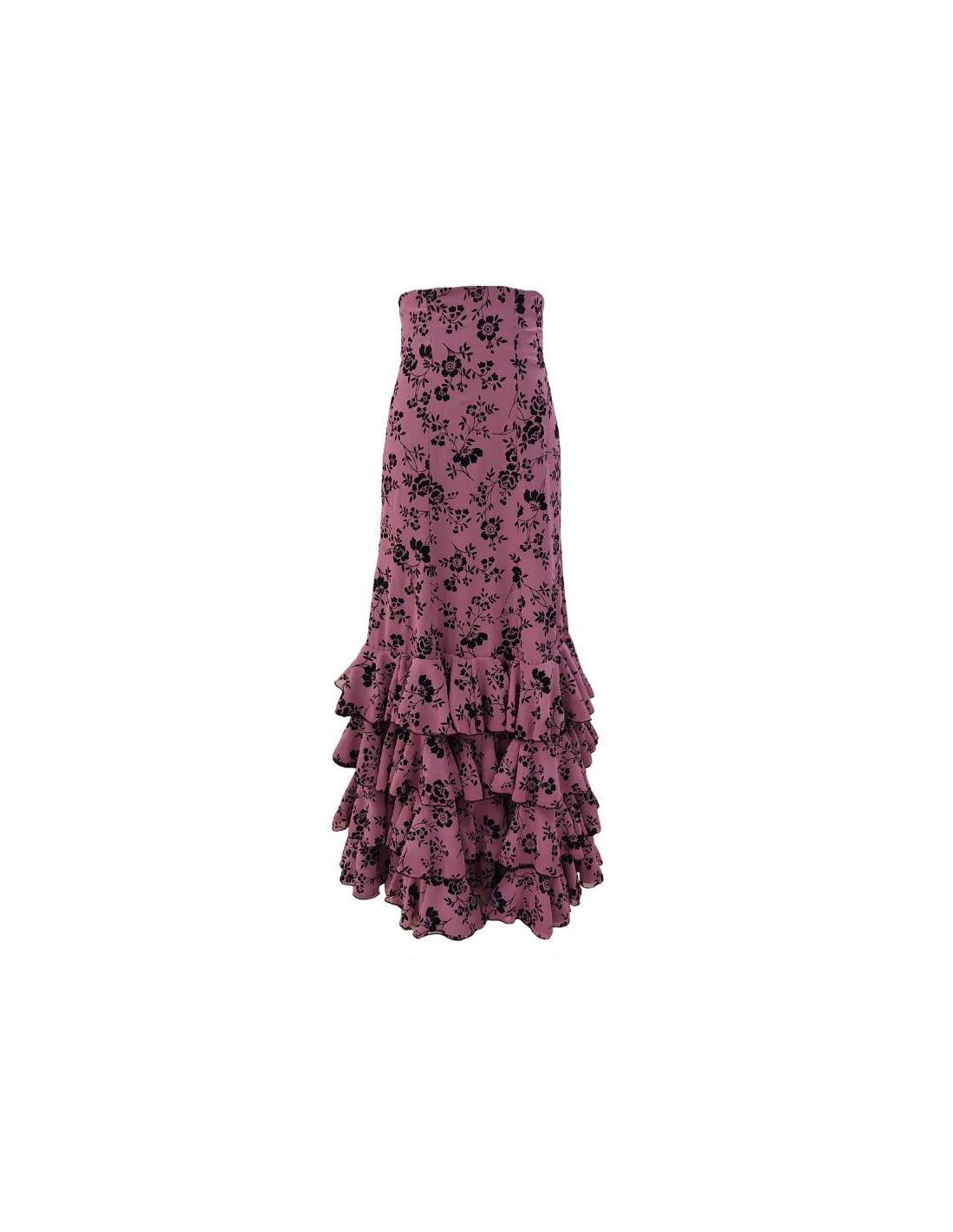 Skirt for professional use, made of chiffon with velvet brocade and crepe. The model has four double flounces. It is fitted through the hip with flared hem.