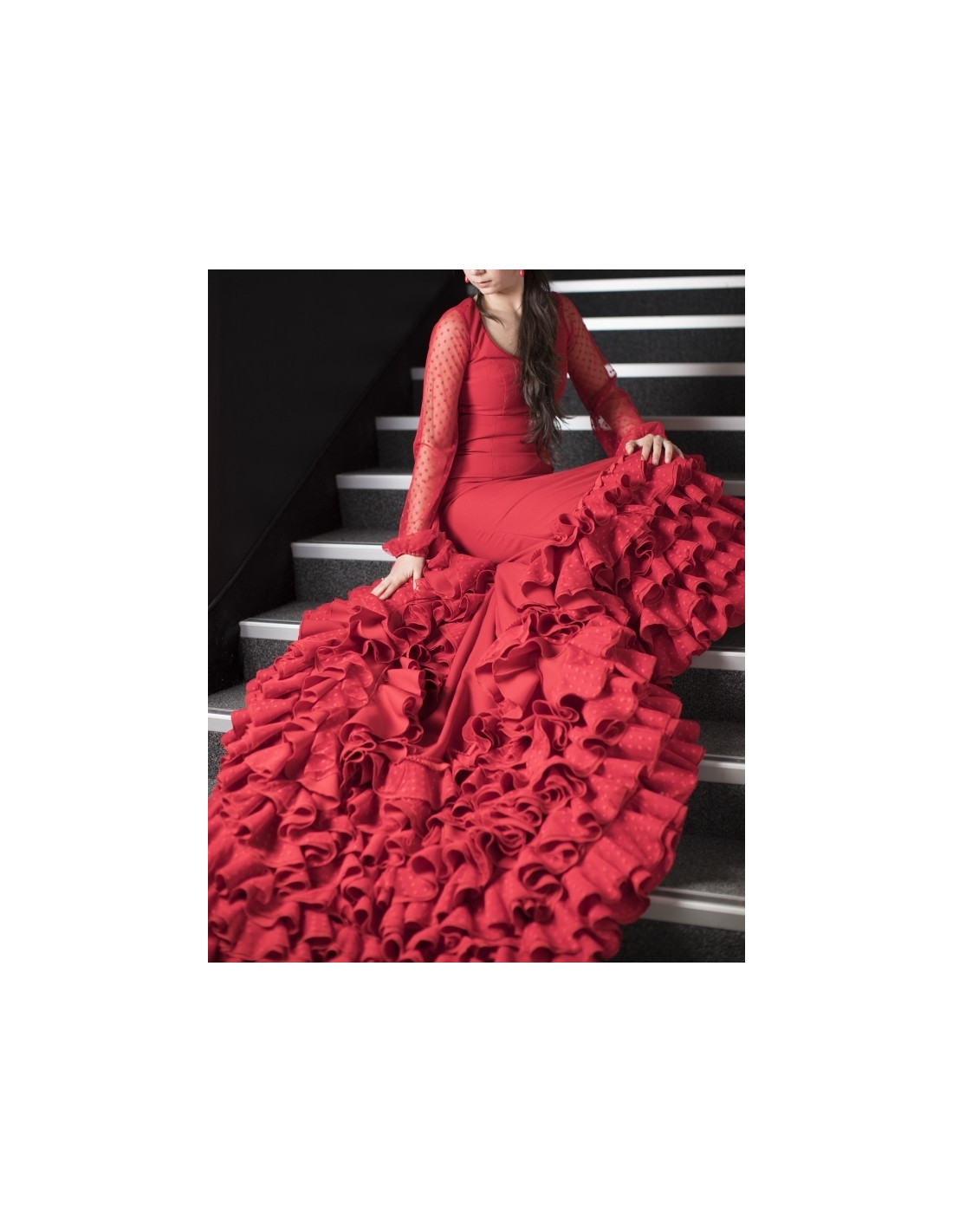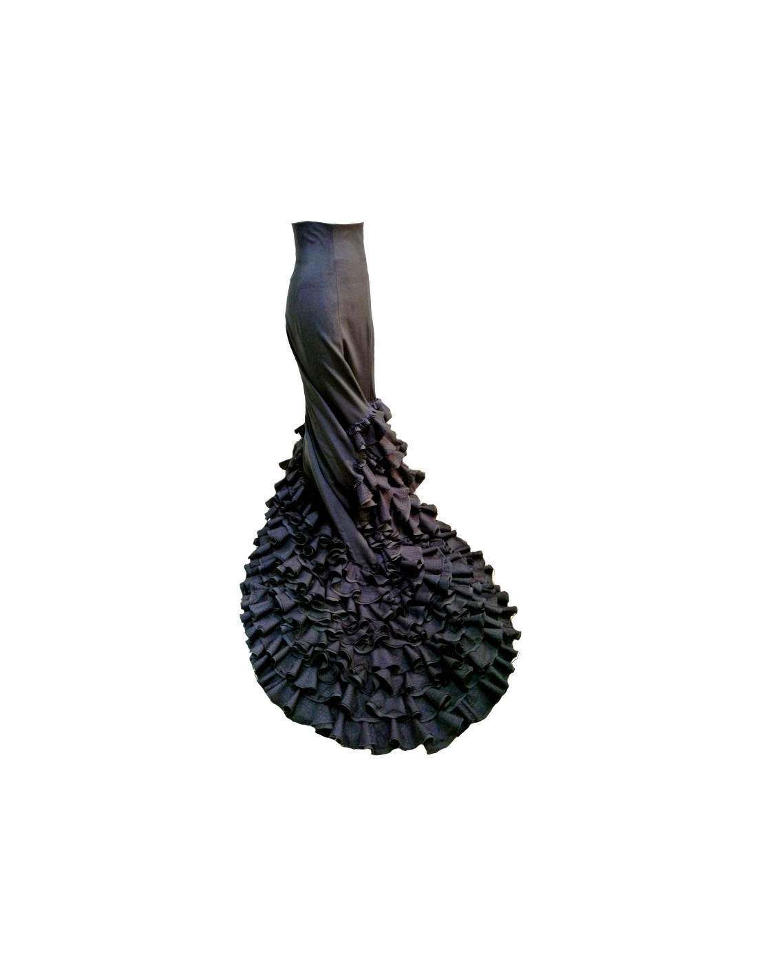 Falda de cola para uso profesional. Confeccionada en strech, un tejido muy resistente y con cuerpo, pero ligero para dar un movimiento de cola fácil. La cola tiene seis volantes dobles (plumeti + strech) delante y nueve detrás. El cancán de abajo está muy fruncido, para que el manejo de la bata sea más fácil y que la cola tenga un movimiento bonito y no se vuelque. ¿Quieres leer más sobre batas de cola AMAY?