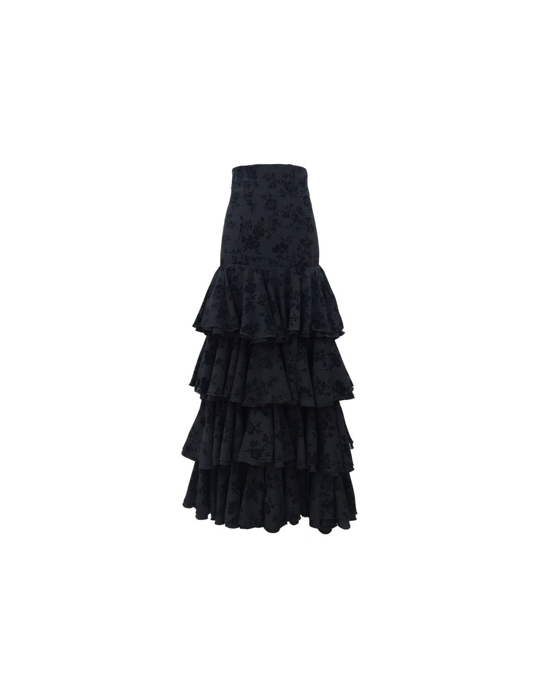 Falda de baile para uso profesional, confeccionada en gasa brocada con terciopelo y crespón. La falda tiene cuatro volantes dobles que parten de la cadera. Tiene vuelo para bailar y usar la falda cómodamente. ¿Quieres leer más sobre faldas de escenario AMAY?